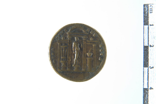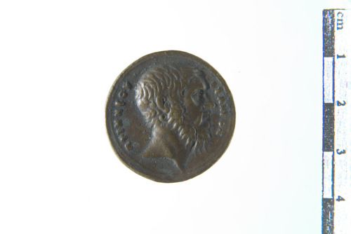 Dritto: Testa barbata a d.; contorno lineare. Rovescio: Facciata di tempio tetrastilo con al centro statua di Apollo con la lira, a s. tripode acceso, a d. vaso; contorno lineare
