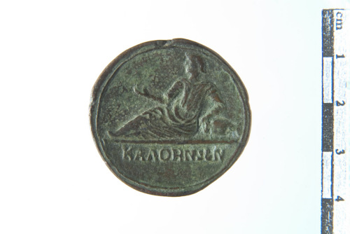 Dritto: Busto femminile drappeggiato a d.; contorno lineare. Rovescio: Figura drappeggiata sdraiata a s. con braccio s. appoggiato su una brocca distesa; contorno lineare