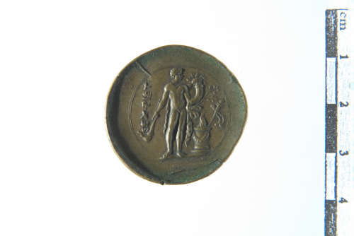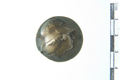 Dritto: Testa con elmo corinzio decorato con pegaso a d.. Rovescio: Genio (?) stante frontalmente rivolto a d. con torcia abbassata e cornucopia, a d. altare acceso con scettro (?); contorno lineare