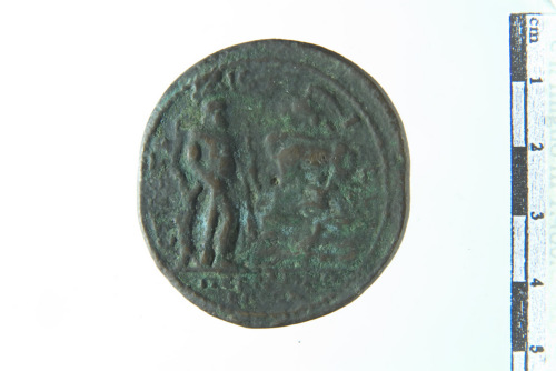 Dritto: Busto laureato e drappeggiato di Commodo a d.; contorno perlinato. Rovescio: Ercole stante con clava a d. di fornte ad aquila stante a s. su roccia, sotto figura umana(?); contorno perlinato