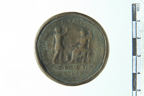 Dritto: Busto laureato e corazzato con lancia di Caracalla a d.; contorno perlinato. Rovescio: Eroe eponimo (?) offerente a s., di fronte a lui Zeus seduto in trono con lancia e scettro; contorno perlinato
