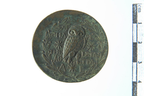 Dritto: Testa di Atena a d. con elmo crestato e istoriato; contorno perlinato. Rovescio: Civetta stante a d. con testa rivolta frontalmente, due stelle ai lati e una in basso; tutto entro corona d'alloro