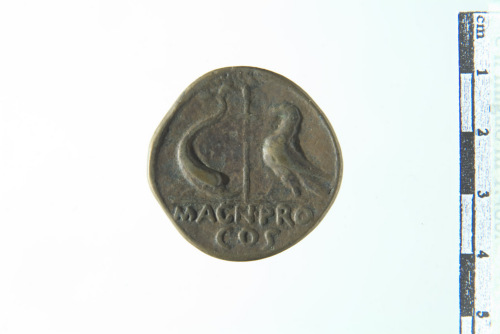 Dritto: Busto laureato e barbato a d.. Rovescio: Aquila stante a s. con ali raccolte, delfino stante a d. appoggiato sul muso; in mezzo spada