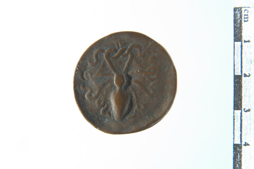 Dritto: Testa di Saffo a d. con capelli raccolti in copricapo a cuffia. Rovescio: Mitile