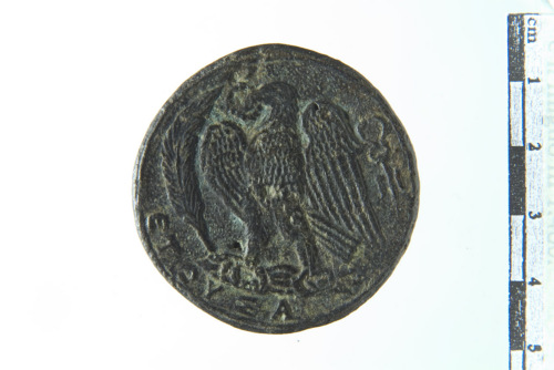 Dritto: Busto laureato e drappeggiato a d.; contorno lineare. Rovescio: Aquila stante a s. con ali dischiuse su ramo di palma, con ghirlanda stretta nel becco; contorno lineare