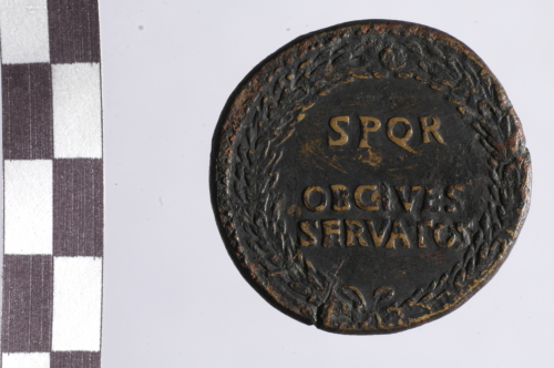 Dritto: testa laureata di Nerone a d.. Rovescio: legenda in corona laurea