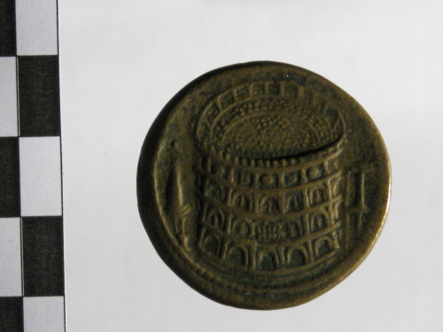 Dritto: busto laureato di Vespasiano a s.. Rovescio: Colosseo con simboli ai lati