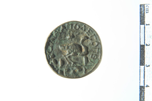 Dritto: Busto coronato con palmette (?) a d.; contorno a bordo. Rovescio: Struzzo (?) incedente a d.; contorno a bordo
