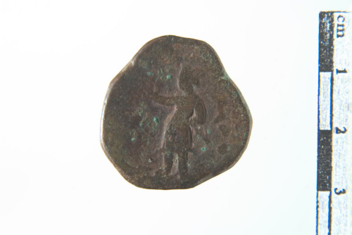 Dritto: Shiva seduto con le gambe incrociate con 4 braccia e sopra cielo nuvoloso, nella s. regge lo scettro e si tiene la vita con la d.. Rovescio: divinità stante verso s.