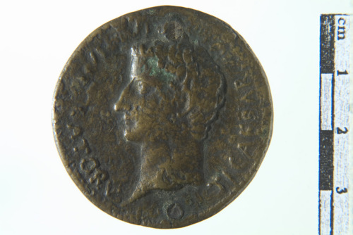 Dritto: profilo di Tiberio laureato a s.. Rovescio: tempio con le lettere SPQR nel frontone