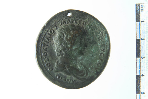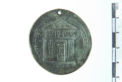 Dritto: Busto drappeggiato di Antinoo a d.; contorno perlinato. Rovescio: Facciata di tempio tetrastilo con decorazione scultorea del fregio, degli intercolumni e all'interno della cella; contorno perlinato
