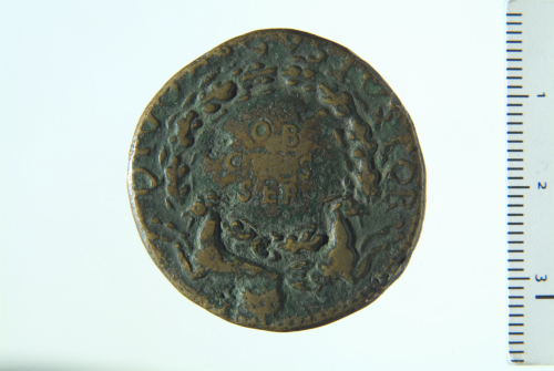 Dritto: Scudo inscritto con OB C[IVE]S SER su tre linee entro corona di quercia sorretta da due capricorni; contorno perlinato. Rovescio: S C entro legenda; contorno perlinato