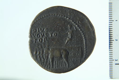 Dritto: Divo Augusto radiato su quadriga di elefanti guidata da quattro uomini a s., con ramo di alloro e scettro; contorno perlinato. Rovescio: S C entro legenda; contorno perlinato