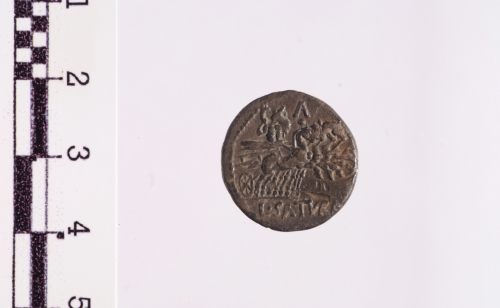 Dritto: Testa elmata di Roma a s.. Rovescio: Saturno in quadriga a d. tiene con la s. le redini e con la d. un'arpa, es. L.SATVRN, segno di zecca A