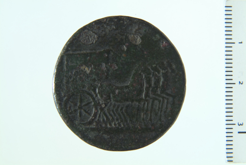 Dritto: Quadriga vuota ornata con Vittoria, trofei e un prigioniero avanza a d.; contorno perlinato. Rovescio: contorno perlinato