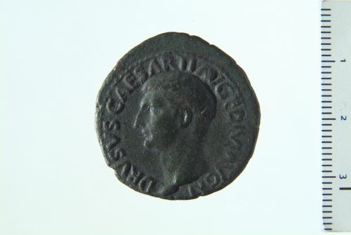 Dritto: Testa laureata di Druso minore a s.; contorno perlinato. Rovescio: contorno perlinato