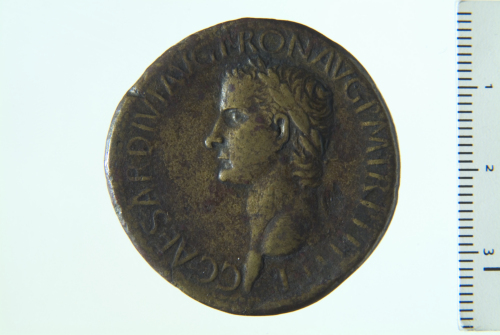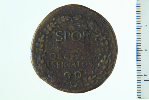 Dritto: Testa laureata di Caligola a s.; contorno perlinato. Rovescio: Legenda entro corona di quercia; contorno perlinato
