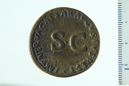 Dritto: Testa del Divo Augusto laureato a d.; contorno perlinato. Rovescio: contorno perlinato