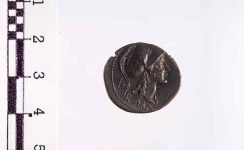 Dritto: Testa elmata di Roma a d. con elmo corinzio alato e ricciolo sulla spalla s. Cerchio di puntini.. Rovescio: Roma, con elmo corinzio, seduta a d. su pila di scudi, trattiene una lancia nella s.; ai piedi, accanto agli scudi un elmo; davanti a lei la lupa allatta i gemelli, ai lati uccelli in volo. Cerchio di puntini.