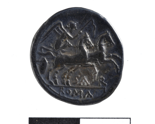 Dritto: Testa elmata di Roma a d. Cerchio di puntini.. Rovescio: Vittoria, in biga a d., trattiene una frusta nella mano d. e le redini nella s. Cerchio lineare.