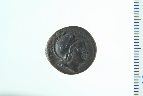 Dritto: Testa elmata di Roma a d., a s. tridente; contorno perlinato. Rovescio: Lupa a s. con zampa sollevata; contorno perlinato