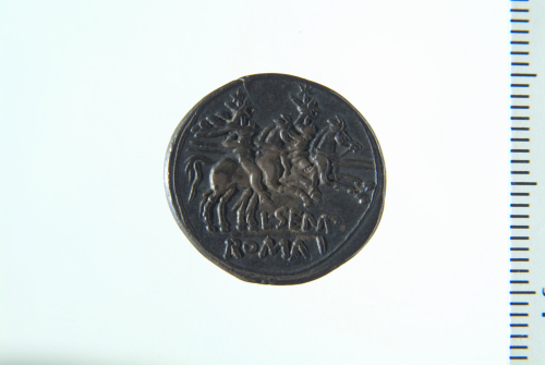 Dritto: Testa di Roma elmata a d.; contorno perlinato. Rovescio: Dioscuri a cavallo a d.; contorno lineare
