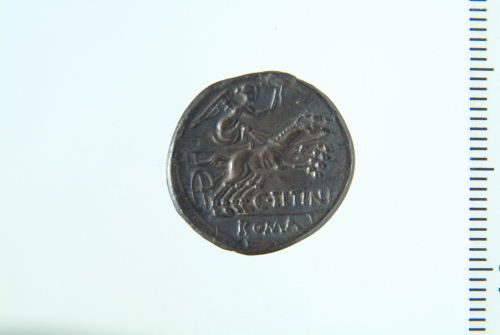 Dritto: Testa di Roma elmata a d.; contorno perlinato. Rovescio: Biga in corsa a d. guidata da Vittoria con frustino e redini; contorno lineare