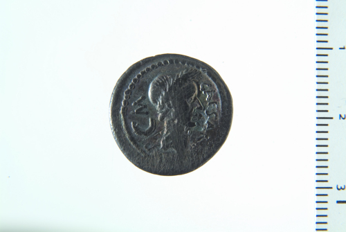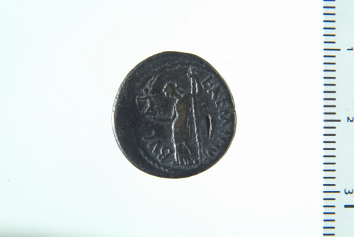 Dritto: Testa laureata di Cesare a d., a s. crescente lunare rivolto verso l'alto; contorno perlinato. Rovescio: Venere stante a s. con Vittoria e scettro; contorno perlinato