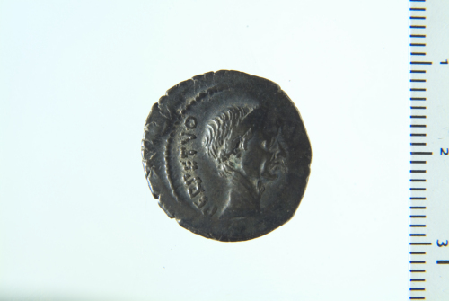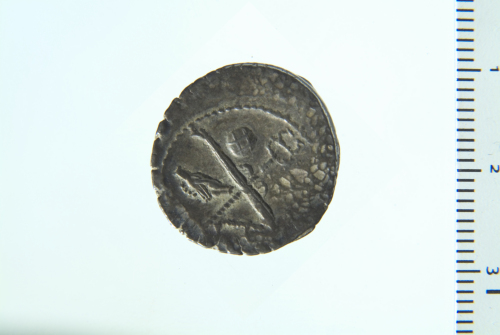 Dritto: Testa laureata di Cesare a d.; contorno perlinato. Rovescio: Fasci incrociati con caduceo alato; in alto globo, in basso ascia, a s. stretta di mani; contorno perlinato