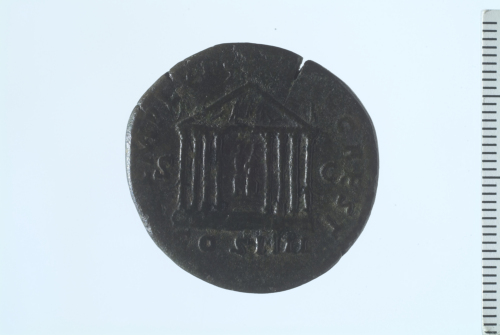Dritto: Testa laureata di Antonino Pio a d.. Rovescio: Tempio con otto colonne in facciata, entro il quale si ergono le statue sedute del Divo Augusto e di Livia.