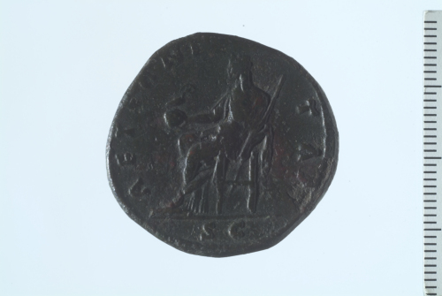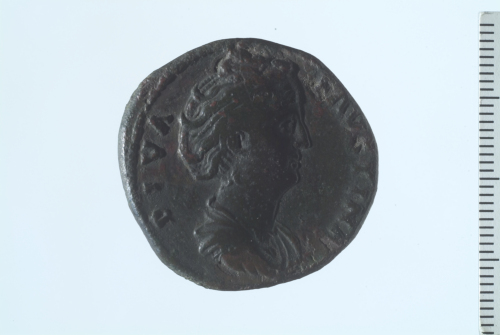 Dritto: Busto drappeggiato di Faustina I a d.. Rovescio: Aeternitas seduta a s., recante scettro e fenice su globo.