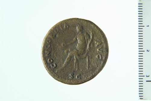 Dritto: Testa laureata di Domiziano a s.; contorno perlinato.. Rovescio: Concordia seduta a s., reggente cornucopia nella s. e patera nella d.; contorno perlinato.