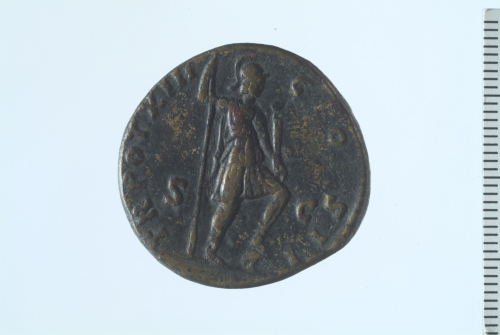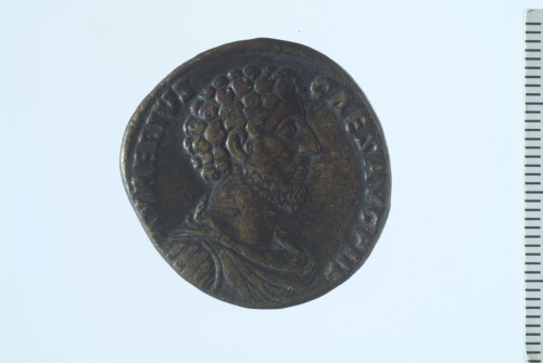 Dritto: Busto drappeggiato e corazzato di Marco Aurelio a d.; contorno perlinato.. Rovescio: Virtus stante a d., recante lancia e parazonium, con piede s. su elmo; contorno perlinato.
