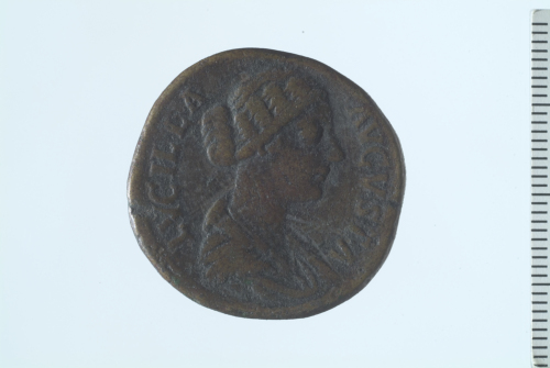 Dritto: Busto drappeggiato di Lucilla a d.; contorno perlinato.. Rovescio: Fecunditas (o Lucilla) seduta a d., in atto di allattare un bambino; altri due bambini stanti, uno davanti e l'altro dietro di lei; contorno perlinato.
