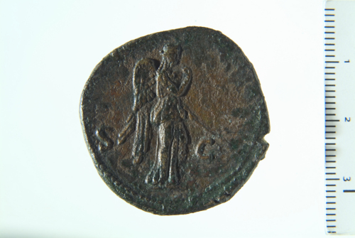 Dritto: Testa laureata di Adriano a d.; contorno perlinato.. Rovescio: Nemesi alata, avanzante a d., reggente ramo nella s.; lembo della veste sollevato con mano d. in un gesto apotropaico; contorno perlinato.