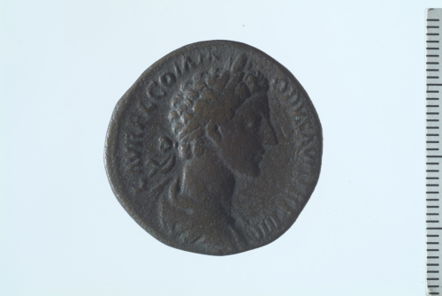Dritto: Busto drappeggiato e laureato di Commodo a d.; contorno perlinato.. Rovescio: Minerva stante a s., appoggiata con la mano s. ad uno scudo e armata di lancia, in atto di offrire incenso su un altare; contorno perlinato.