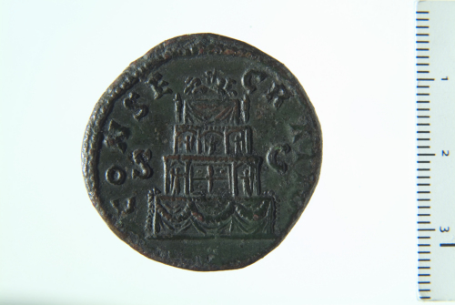 Dritto: Testa nuda di Antonino Pio a d.; contorno perlinato.. Rovescio: Pira di quattro piani decorata con ghirlande e sormontata da quadriga; contorno perlinato.