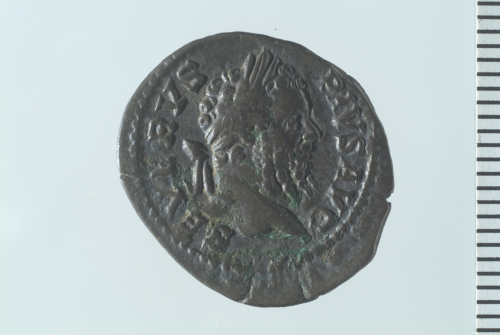 Dritto: Testa laureata di Settimio Severo a d.; contorno perlinato.. Rovescio: Giove stante a s.,con due bambini ai suoi piedi, recante fulmine e scettro; contorno perlinato.