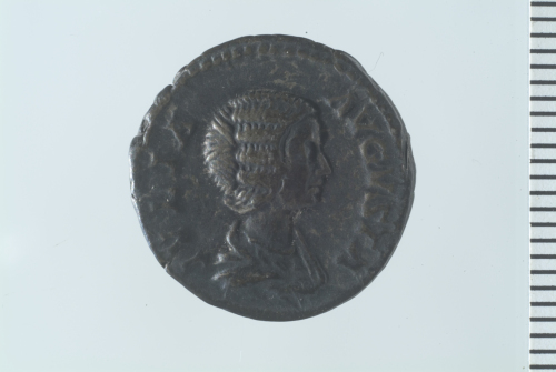 Dritto: Busto drappeggiato di Giulia Domna a d.; contorno perlinato.. Rovescio: Pietas stante presso altare, in atto di alzare al cielo entrambe le mani; contorno perlinato.