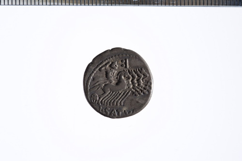 Dritto: Testa galeata di Roma a s.; c.p.. Rovescio: Desultor a s. corazzato; sotto i cavalli, un topo andante a sDue Saturno in quadriga a d. che regge le redini con la mano s. e una harpa con la d.; c.p.