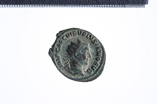 Dritto: Busto radiato e drappeggiato di Volusiano a d.; contorno perlinato.. Rovescio: Pax stante a s. con ramo e scettro trasversale; contorno perlinato.