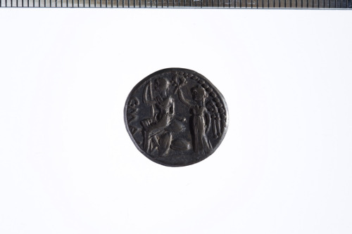 Dritto: Testa laureata di Apollo a d.; sotto il collo, X barrato; c.p.. Rovescio: Roma seduta a s. su una pila di scudi, che regge una spada con la mano s. e una lancia con la d., e che viene incoronata da una vittoria; c.p.