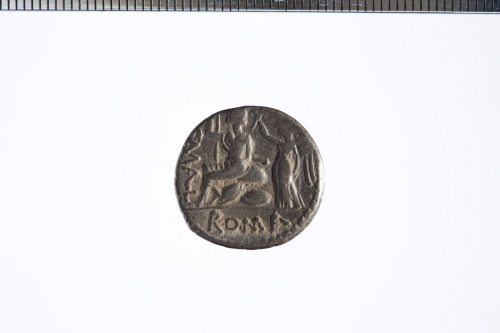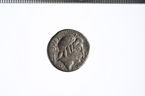 Dritto: Testa laureata di Apollo a d.; sotto il collo, X barrato; c.p.. Rovescio: Roma seduta a s. su una pila di scudi, che regge una spada con la mano s. e una lancia con la d., e che viene incoronata da una vittoria; c.p.