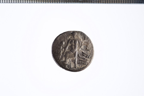 Dritto: Testa galeata di Marte a d. Con elmo crestato e piume ai lati; sopra, un martello; davanti X barrato; c.p.. Rovescio: Guerriero nudo stante a s. che regge una lancia con la mano d. e poggia il piede d. su una corazza; as. Un trofeo; a d. una prora di nave; c.p.