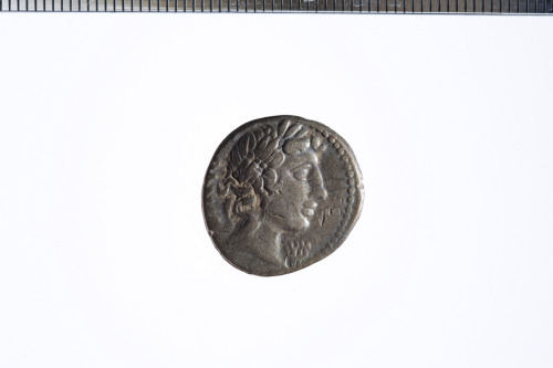 Dritto: Testa laureata di Apollo a d.; sotto il mento un simbolo o lettera di controllo non meglio identificabile; c.p.. Rovescio: Minerva in quadriga a d. che regge redini e una lancia con la mano s. e un trofeo con la d.; c.p.