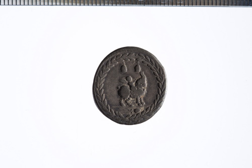Dritto: Testa laureata di Apollo a d. con sotto un fulmine; c.p.. Rovescio: Cupido su un caprone a d.; sopra i pilei ; in esergo un thyrsus, in tutto all'interno di una corona d'alloro; c.p.