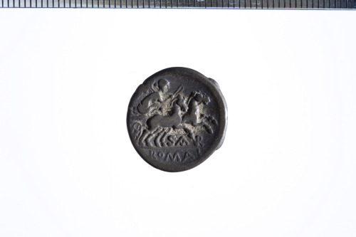 Dritto: Testa galeata di Roma a d.; dietro simbolo di valore X; c.p.. Rovescio: Vittoria su biga al galoppo a d., regge le redini con la s. e una frusta nella d.; es. ROMA in contorno lineare