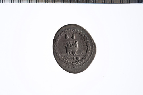 Dritto: Testa laureata di Apollo a d. con sotto un fulmine; c.p.. Rovescio: Cupido su un caprone a d.; sopra i pilei ; in esergo un thyrsus, in tutto all'interno di una corona d'alloro; c.p.