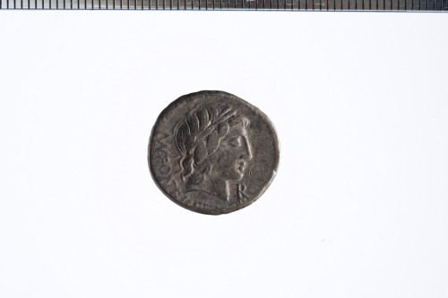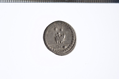 Dritto: Testa laureata di Apollo a d. con sotto un fulmine; c.p.. Rovescio: Cupido su un caprone a d.; sopra i pilei ; in esergo un thyrsus, in tutto all'interno di una corona d'alloro; c.p.