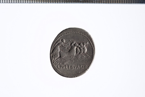 Dritto: Testa maschile a d. laureata, con le ali e con dietro un tridente (attributi di Apollo, Mercurio e Nettuno); dietro come simbolo una X barrata; c.p.. Rovescio: Vittoria in quadriga a d. che regge le redini con la mano s. e una corona con la d.; c.p.
